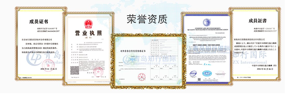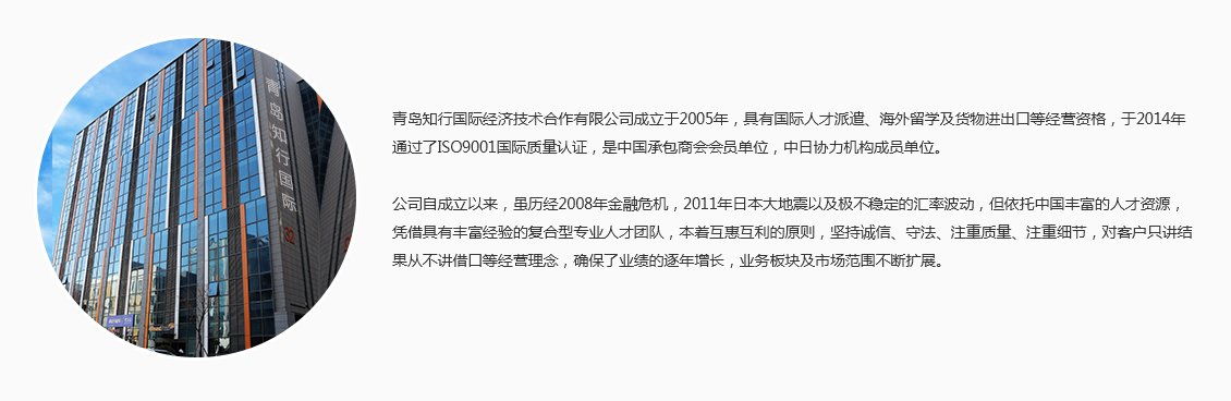 青島知行國(guó)際經(jīng)濟(jì)技術(shù)合作有限公司成立于2005年,具有國(guó)際人才派遣、海外留學(xué)及貨物進(jìn)出口等經(jīng)營(yíng)資格,于2014年通過(guò)了ISO9001國(guó)際質(zhì)量認(rèn)證,是中國(guó)承包商會(huì)會(huì)員單位,中日協(xié)力機(jī)構(gòu)成員單位。
