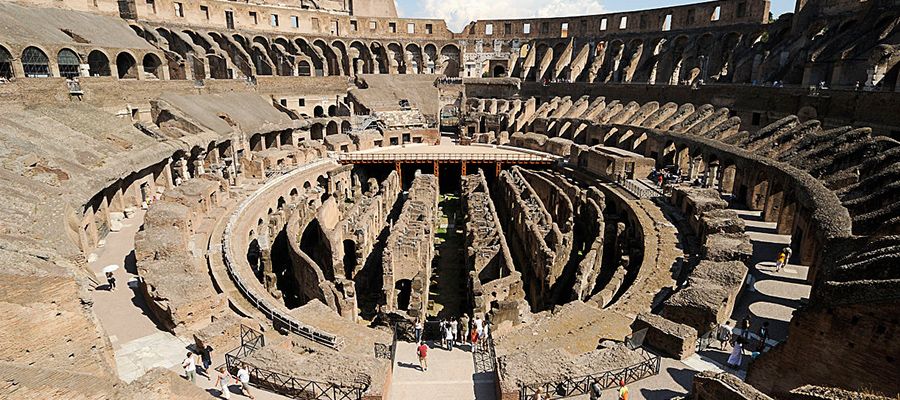斗獸場由韋斯帕薌(Vespasian)皇帝下令修建,是古羅馬當時為取悅凱旋的將領士兵和贊美偉大的古羅馬帝國而建造的。在其兒子圖密善在位期間建成,是古羅馬帝國標志性的建筑物之一。斗獸場建在另一個羅馬皇帝尼祿的“金宮”(Domus Aurea)原址之上,這個宮殿在公元64年發生的羅馬大火中被燒毀。斗獸場是古羅馬舉行人獸表演的地方,參加的角斗士要與一只野獸搏斗直到一方死亡為止,也有人與人之間的搏斗。根據羅馬史學家狄奧·卡西烏斯(Dio Cassius)的記載,斗獸場建成時羅馬人舉行了為期100天的慶?;顒樱讱⒘?000只牲畜。