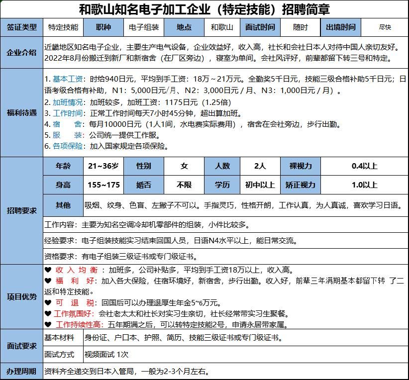 主要負責電路板的組裝,檢查工作;要求電子組裝,涂裝技能實習結(jié)束回國人員;平均到手工資20萬日元以上。