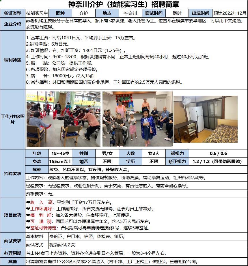 養老機構主要服務于在日本的華人,旗下有3家設施,老人托管為主。位置都在橫濱市繁華地區,可以用中文溝通,交流沒有障礙。主要負責觀察老人的健康狀態,提供配餐服務,協助洗澡,輔助康復運動,組織各種活動等。平均到手工資17萬日元左右。