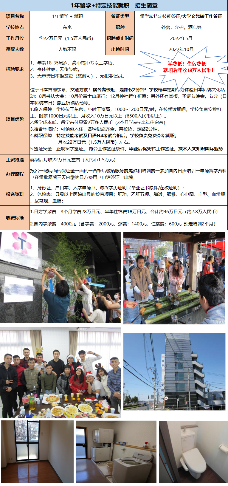 東京半年留學轉特定技能,半年后可就職!就職工種多!100%保證就職!