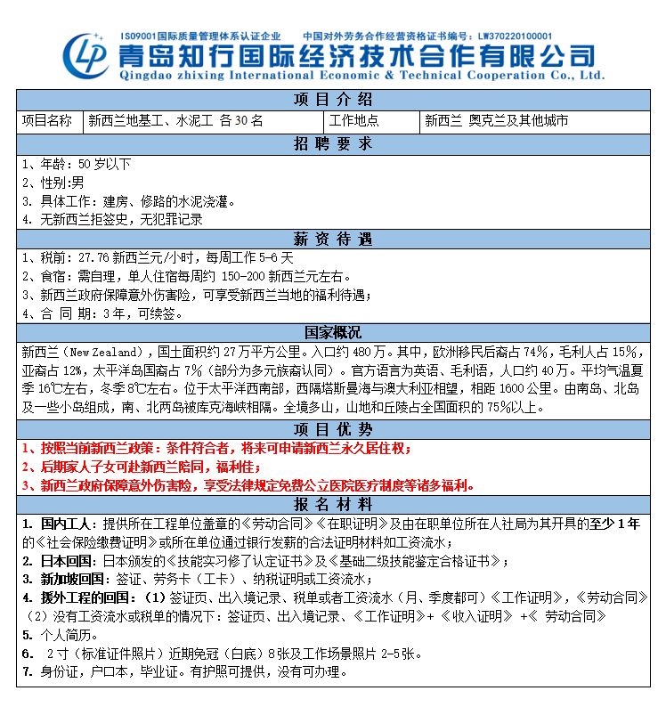 要求:男,40歲以下,身體健壯,吃苦耐勞,會建筑方面工作者優先;稅前25新西蘭元/小時。