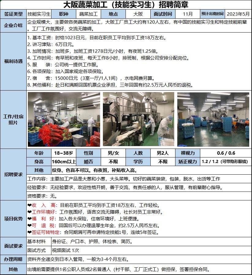 本會社主要是做蔬菜加工,具體工作內(nèi)容有切蔬菜,裝箱,裝卸車,會修機(jī)器更好。需要性格開朗,日語學(xué)習(xí)能力強(qiáng),有耐力,患有頸椎、腰疼等關(guān)節(jié)病,慢性病的不可以。