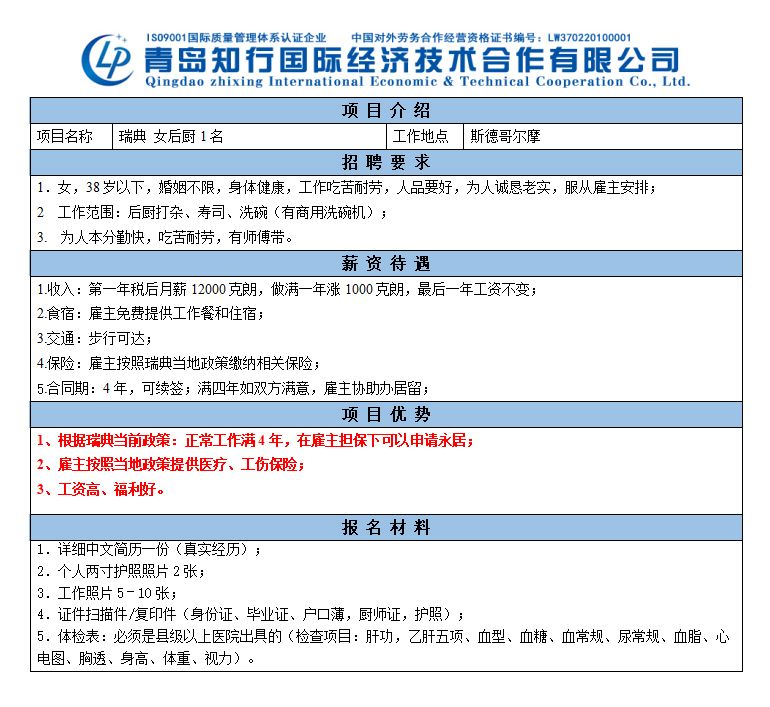 要求48歲以下,人品好,工作勤快,服從安排; 工作態(tài)度:積極主動(dòng),吃苦耐勞,有團(tuán)隊(duì)精神,會(huì)壽司者更佳;稅后到手月薪19000瑞典克朗,后期根據(jù)個(gè)人能力漲薪