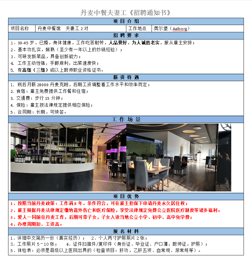 丹麥超高薪夫妻項目來咯!28000丹麥克朗包吃住,餐廳規模大,值得信賴。目前需要兩對夫妻,若單人申請也可考慮。