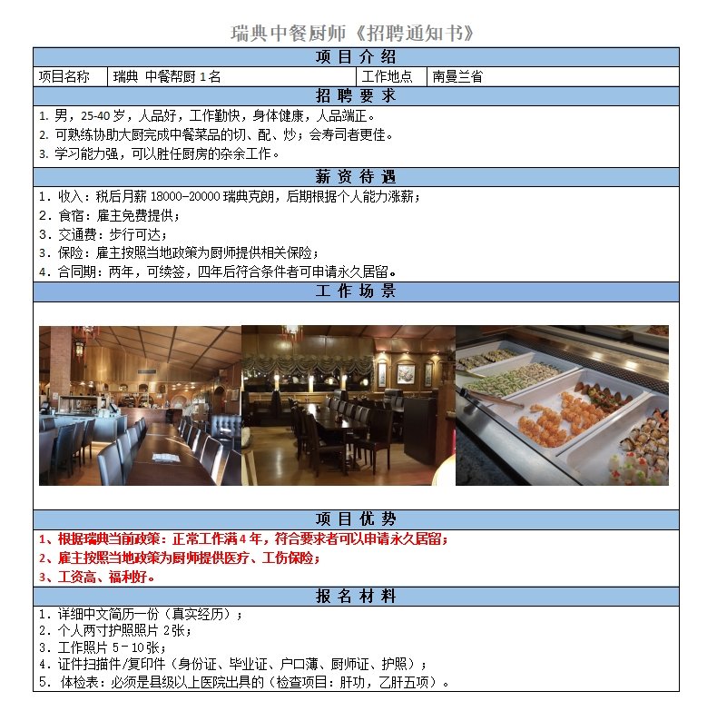 中餐廚師;菜系不限,熟練切配、炒鍋;取得中級廚師證或中級廚師證以上;起薪稅后20000瑞典克朗,后期視工作能力漲薪