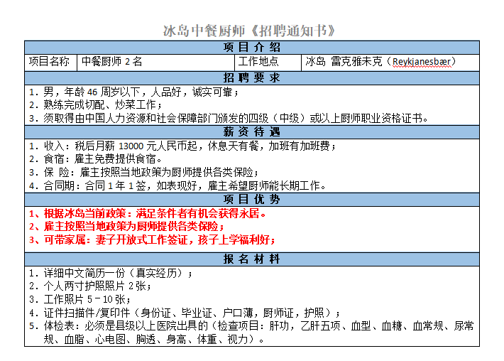 年齡43歲以內,3年以上炒鍋經驗;無地域要求;每天工作8小時,管吃管住26萬冰島克朗。