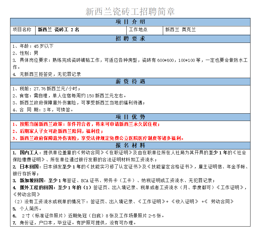要求45歲以下,男性,會熟練完成噴涂油漆工作,日本回國的優(yōu)先。稅前27.76新西蘭元/小時(shí)。