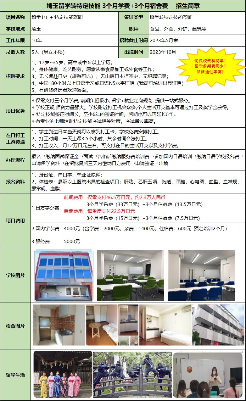 前期負(fù)擔(dān)小,留學(xué)+就業(yè)定向規(guī)劃,將來多種就業(yè)選擇;在校期間會安排日本企業(yè)面試,錄取后就可轉(zhuǎn)特定技能簽證;學(xué)校免費(fèi)安排打工,個人生活開支基本可通過打工及獎學(xué)金獲得