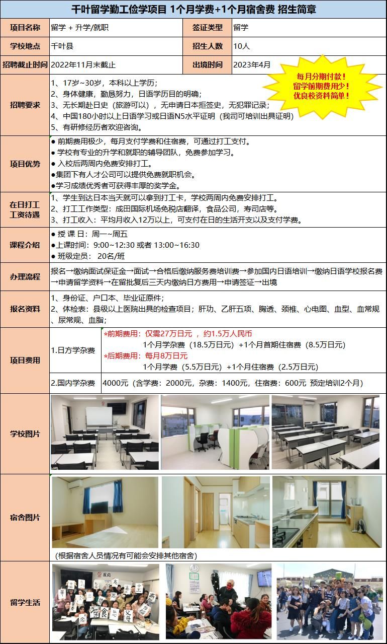 首期費用低,約2.4萬人民幣,后續(xù)按照季度支付學費;提供高性價比的宿舍家電齊全拎包入住;學校免費安排打工,每周28小時以內(nèi),每月收入11-15萬日元