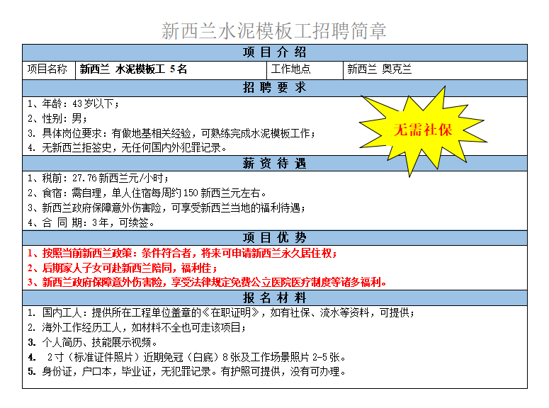 技術(shù)過硬、大工熟手,干活速度快質(zhì)量好、踏實、懂得團隊配合、服從管理。三年以上海外建筑工作經(jīng)驗,無新西蘭拒簽史,無犯罪記錄,需要培訓語言。