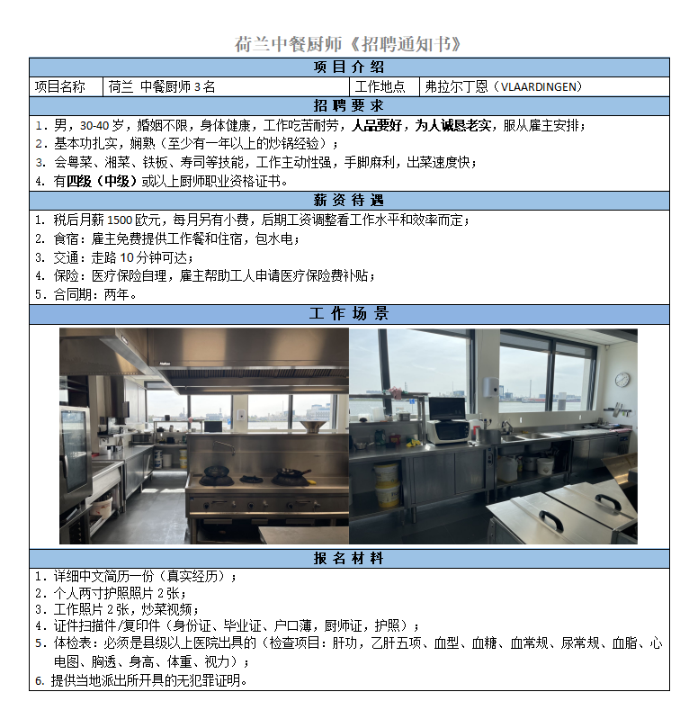 會(huì)做魯菜與川菜、持有中級(jí)或以上廚師證,稅后1350-1500歐元/月起薪;雇主免費(fèi)提供食宿。