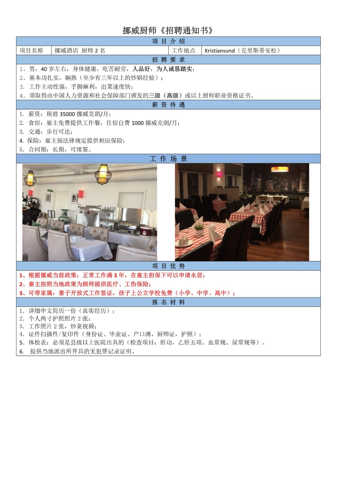 要求47歲以下、男性、高級廚師證、菜系不限,可獨立完成廚房全般工作,如烹飪、備貨、衛(wèi)生.稅后23000挪威克朗/月以上,有度假金