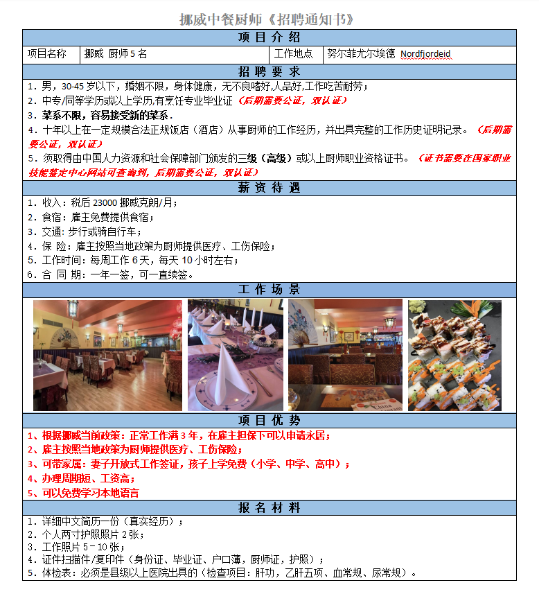 要求47歲以下、男性、高級廚師證、菜系不限,可獨立完成廚房全般工作,如烹飪、備貨、衛生.稅后23000挪威克朗/月以上,有度假金