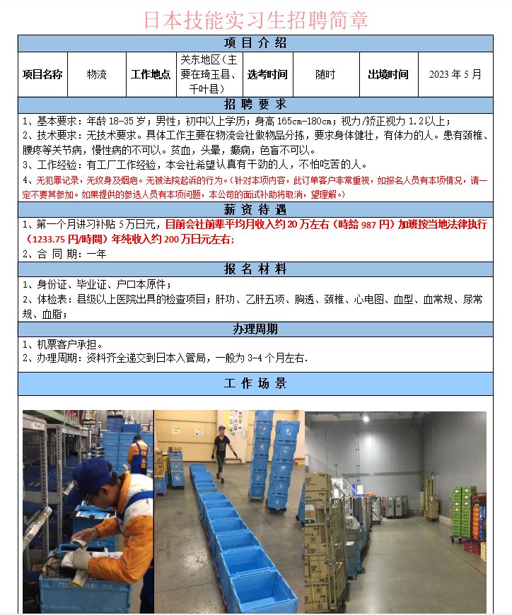 具體工作主要在物流會社做物品分揀,要求身體健壯。