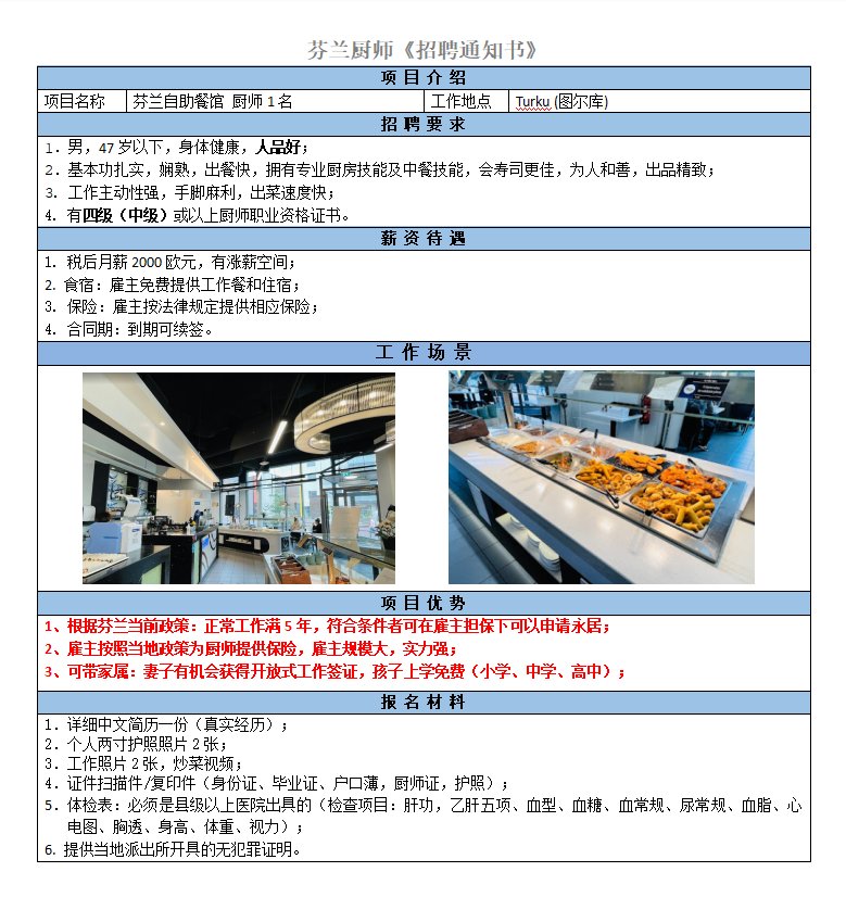 芬蘭高薪項(xiàng)目:包吃住,包水電,住宿地點(diǎn)離餐廳步行十分鐘,月薪2400歐(接近1.7w人民幣)純凈到手收入,要求40歲以下踏實(shí)樸實(shí)的師傅,不限地域不限菜系。