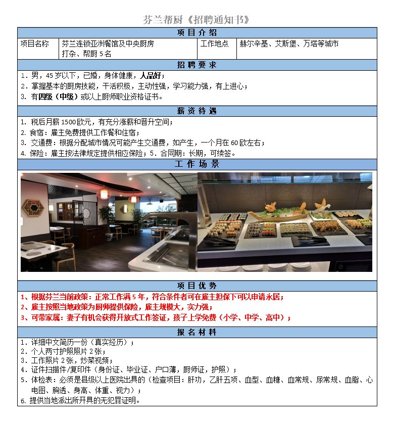 芬蘭高薪項目:包吃住,包水電,住宿地點離餐廳步行十分鐘,月薪2400歐(接近1.7w人民幣)純凈到手收入,要求40歲以下踏實樸實的師傅,不限地域不限菜系。