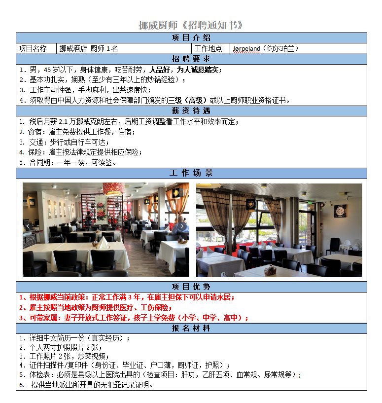 要求47歲以下、男性、高級廚師證、菜系不限,可獨(dú)立完成廚房全般工作,如烹飪、備貨、衛(wèi)生.稅后23000挪威克朗/月以上,有度假金