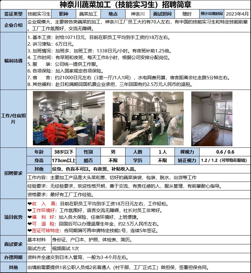 本會社主要是做蔬菜加工,具體工作內容有切蔬菜,裝箱,裝卸車,會修機器更好。需要性格開朗,日語學習能力強,有耐力,患有頸椎、腰疼等關節病,慢性病的不可以。
