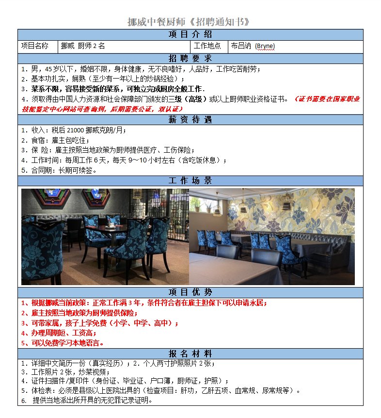 要求47歲以下、男性、高級廚師證、菜系不限,可獨立完成廚房全般工作,如烹飪、備貨、衛生.稅后23000挪威克朗/月以上,有度假金