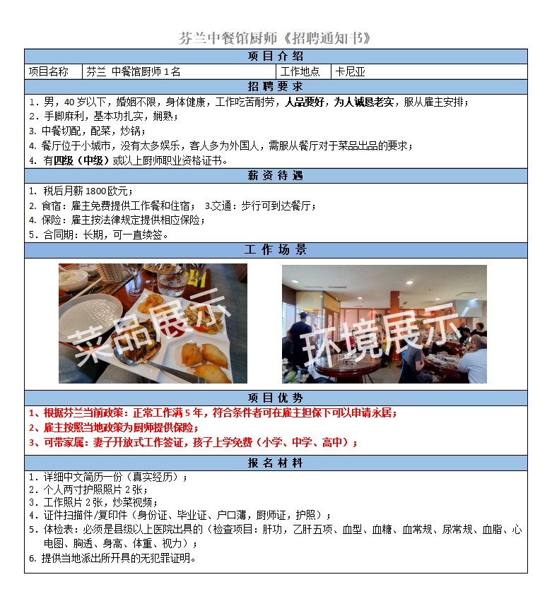 芬蘭高薪項目:包吃住,包水電,住宿地點離餐廳步行十分鐘,月薪2400歐(接近1.7w人民幣)純凈到手收入,要求40歲以下踏實樸實的師傅,不限地域不限菜系。