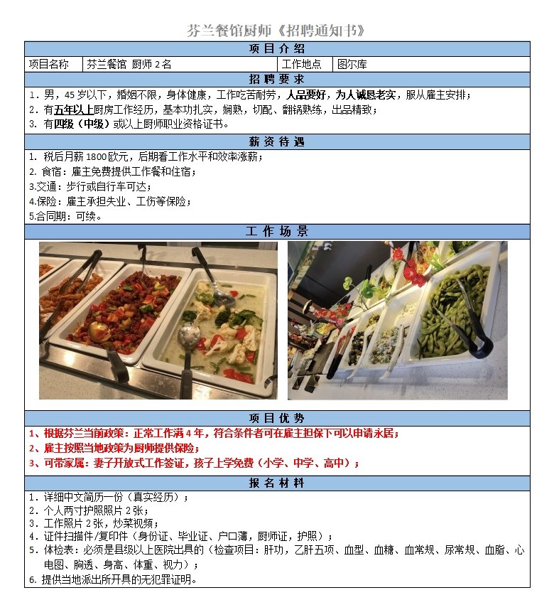 芬蘭高薪項目:包吃住,包水電,住宿地點離餐廳步行十分鐘,月薪2400歐(接近1.7w人民幣)純凈到手收入,要求40歲以下踏實樸實的師傅,不限地域不限菜系。