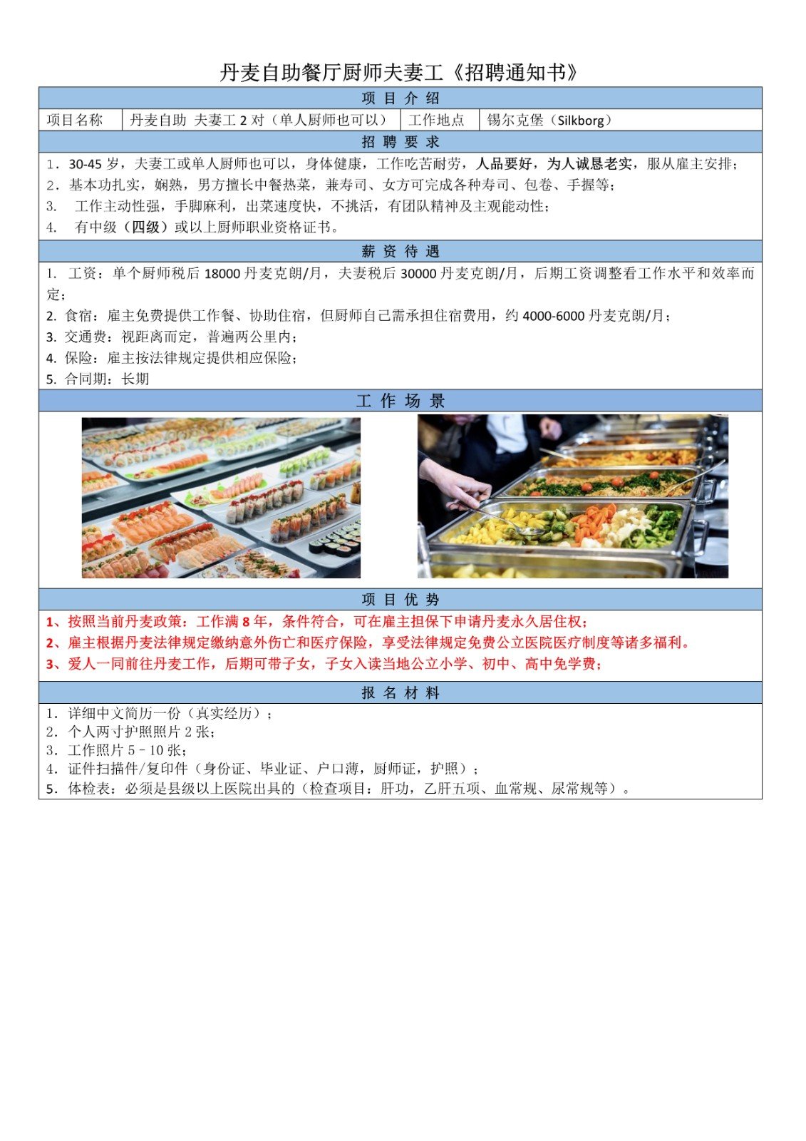 男方主要負責切配、炒鍋、油鍋、壽司等;女方負責壽司及廚房其他工作;稅后22000丹麥克朗/月,后期根據表現漲薪;