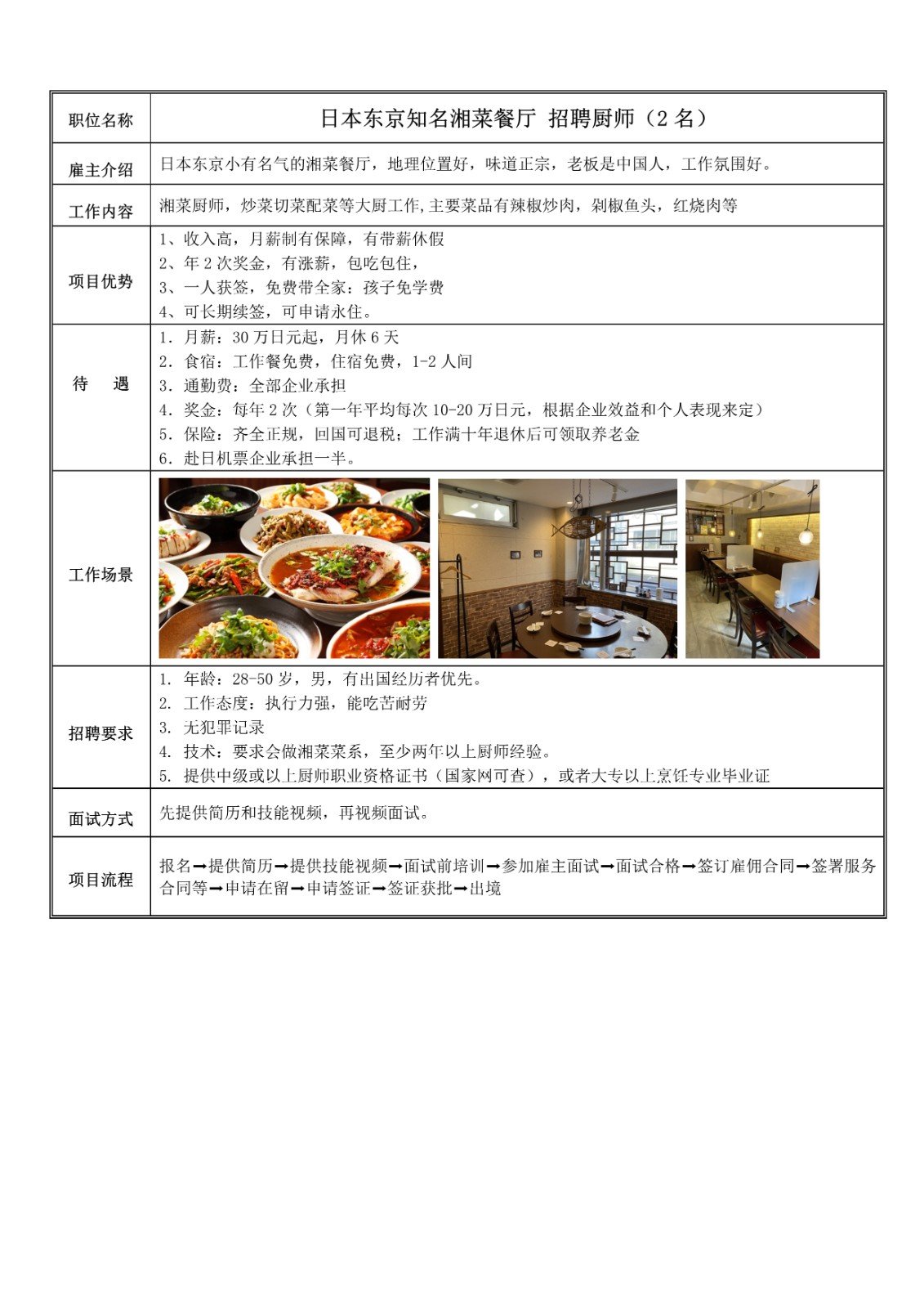 湘菜廚師,炒菜切菜配菜等大廚工作,主要菜品有辣椒炒肉,剁椒魚(yú)頭,紅燒肉等;月薪30萬(wàn)日元起,月休6天;工作餐免費(fèi),住宿免費(fèi)