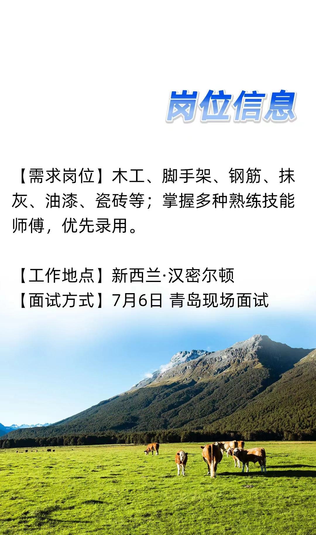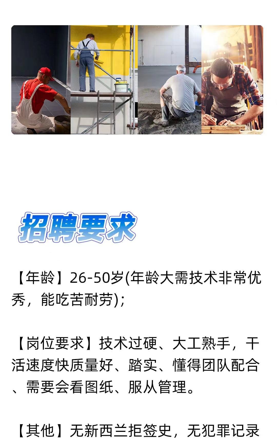 技術(shù)過(guò)硬、大工熟手,干活速度快質(zhì)量好、踏實(shí)、懂得團(tuán)隊(duì)配合、服從管理。三年以上海外建筑工作經(jīng)驗(yàn),無(wú)新西蘭拒簽史,無(wú)犯罪記錄,需要培訓(xùn)語(yǔ)言。