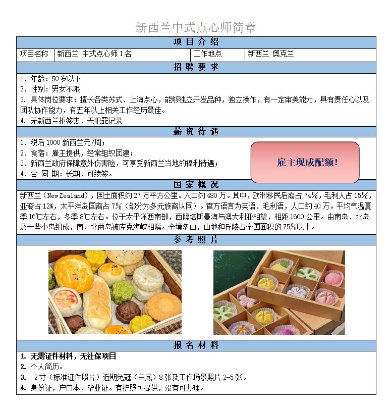 菜系不限,需要有真實(shí)的廚師經(jīng)驗(yàn),切配炒鍋嫻熟。稅后950新西蘭元/周,如后期表現(xiàn)良好,可加薪;