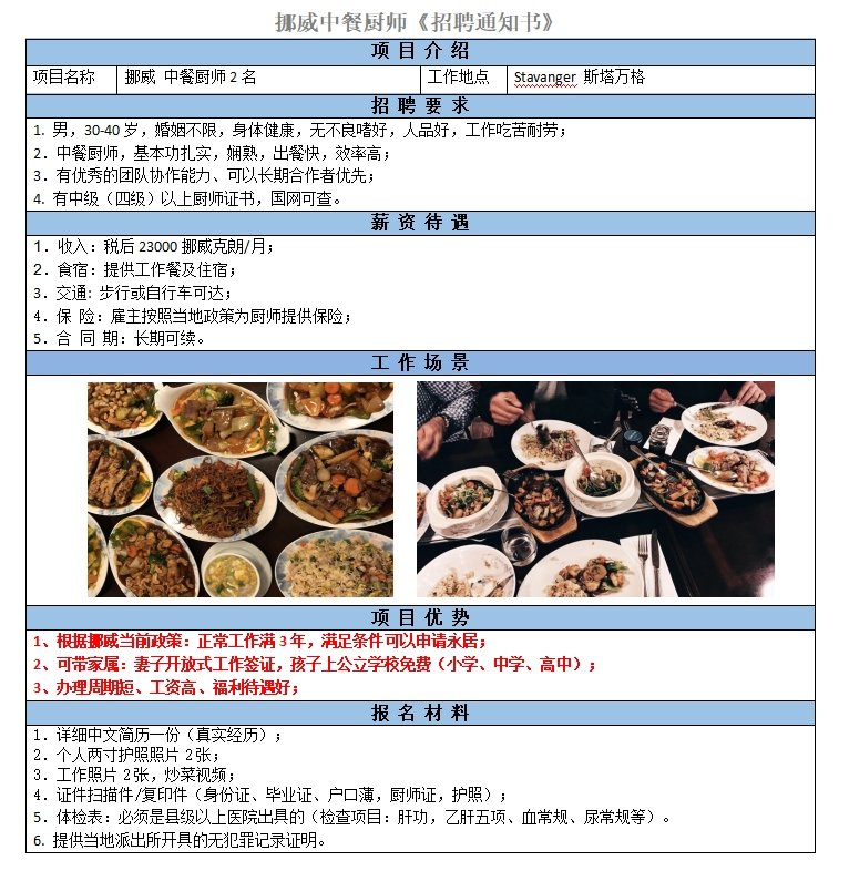 45歲以下、男性、高級廚師證、粵菜菜系,或亞洲融合菜,會面點者更佳。稅后21000挪威克朗/月以上,加班有加班費。