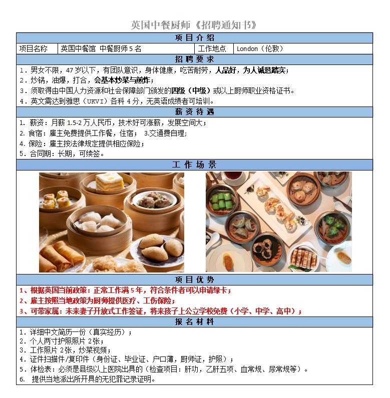 擅長川菜、北方菜、懂火鍋燒烤最好,可完成廚房全般工作,不挑活,工作主動性強,手腳麻利;須取得由中國人力資源和社會保障部門頒發的四級(中級)或以上廚師職業資格證書。英文需達到雅思(UKVI)各科4分,無英語成績者可培訓。