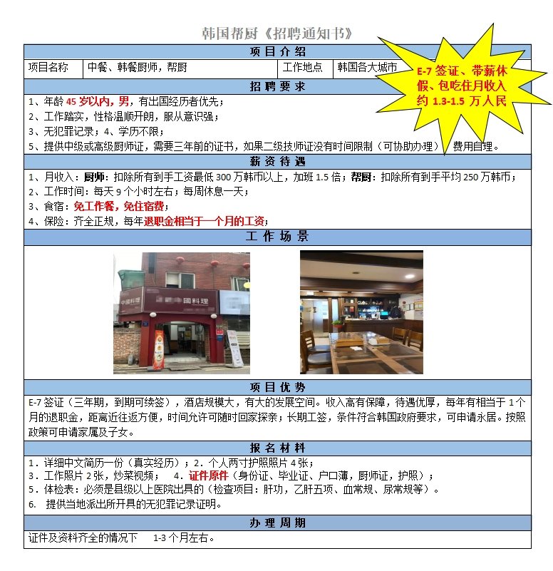 年齡45歲以內,男女都可,有出國經歷者優先;能做菜最好,表現好有機會升任廚師;工作踏實,性格溫順開朗,服從意識強;無犯罪記錄;學歷不限;提供中級或高級廚師證,需要三年前的證書,如果二級技師證沒有時間限制(可協助辦理),費用自理。