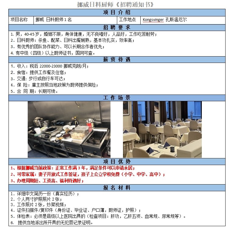 要求47歲以下、男性、高級廚師證、菜系不限,可獨立完成廚房全般工作,如烹飪、備貨、衛生.稅后23000挪威克朗/月以上,有度假金