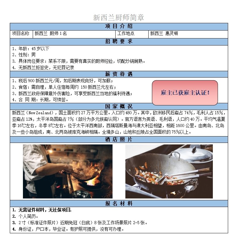 菜系不限,需要有真實的廚師經驗,切配炒鍋嫻熟。無需社保,稅后900新西蘭元/周,后期表現良好,可加薪。