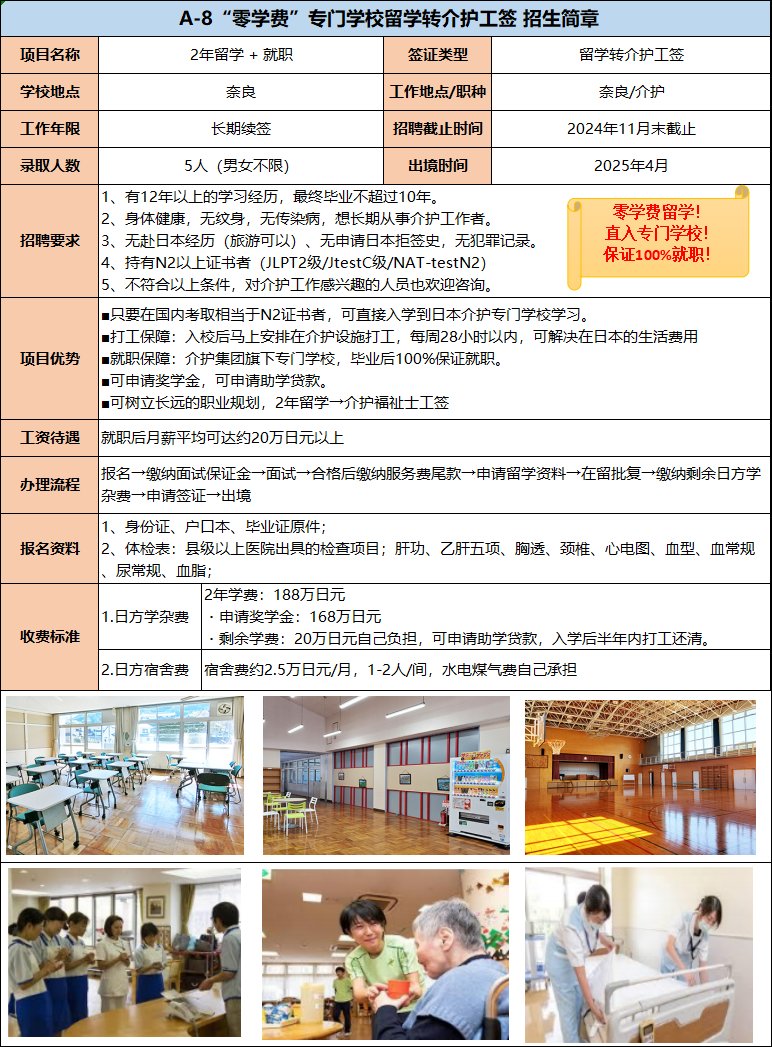 免留學期間學費,前期成本低;入校后會盡快安排在介護設施打工,收入12萬日元左右,可解決在日本的生活費用