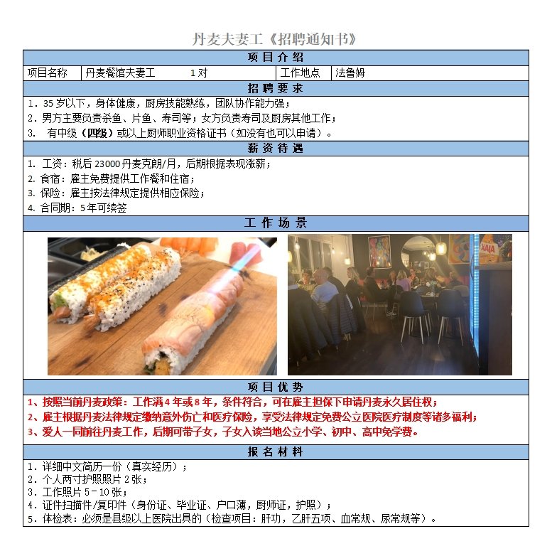 男方主要負責日料制作、女方負責壽司等其他廚房事務,男方會一點英語最佳;稅后22000丹麥克朗/月,后期根據表現漲薪