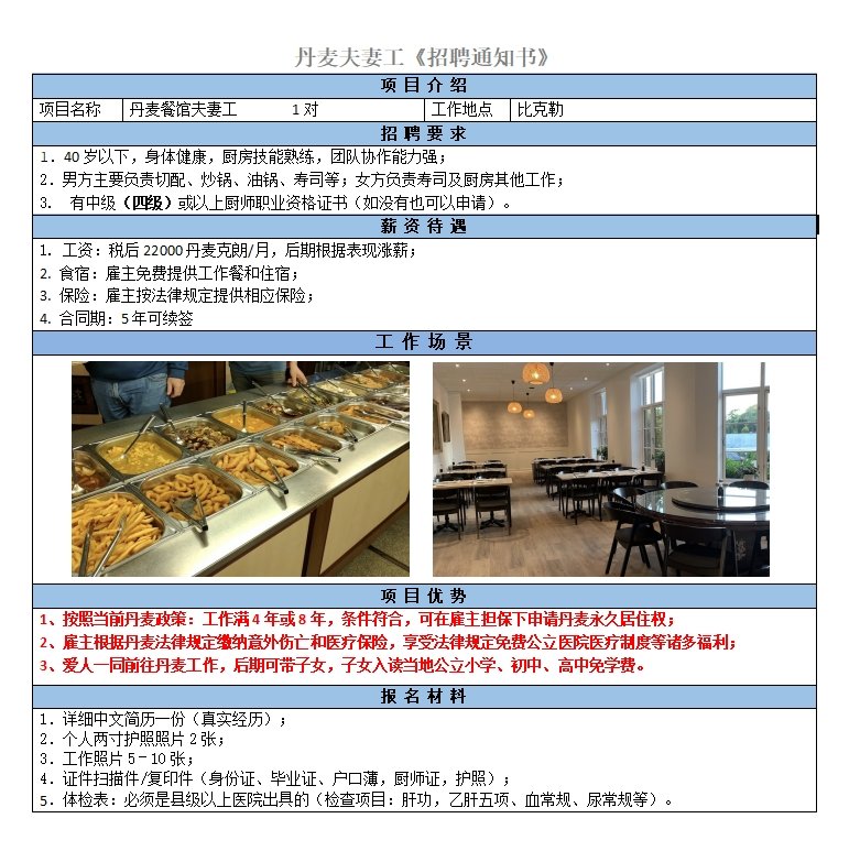 男方熟練炒鍋,擅長川菜;女方有無后廚經(jīng)驗都可;稅后22000丹麥克朗/月,后期根據(jù)表現(xiàn)漲薪。