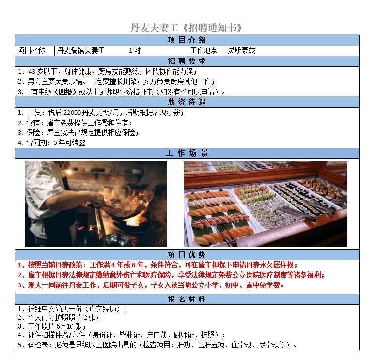 男方熟練炒鍋,擅長川菜;女方有無后廚經(jīng)驗(yàn)都可;稅后22000丹麥克朗/月,后期根據(jù)表現(xiàn)漲薪。