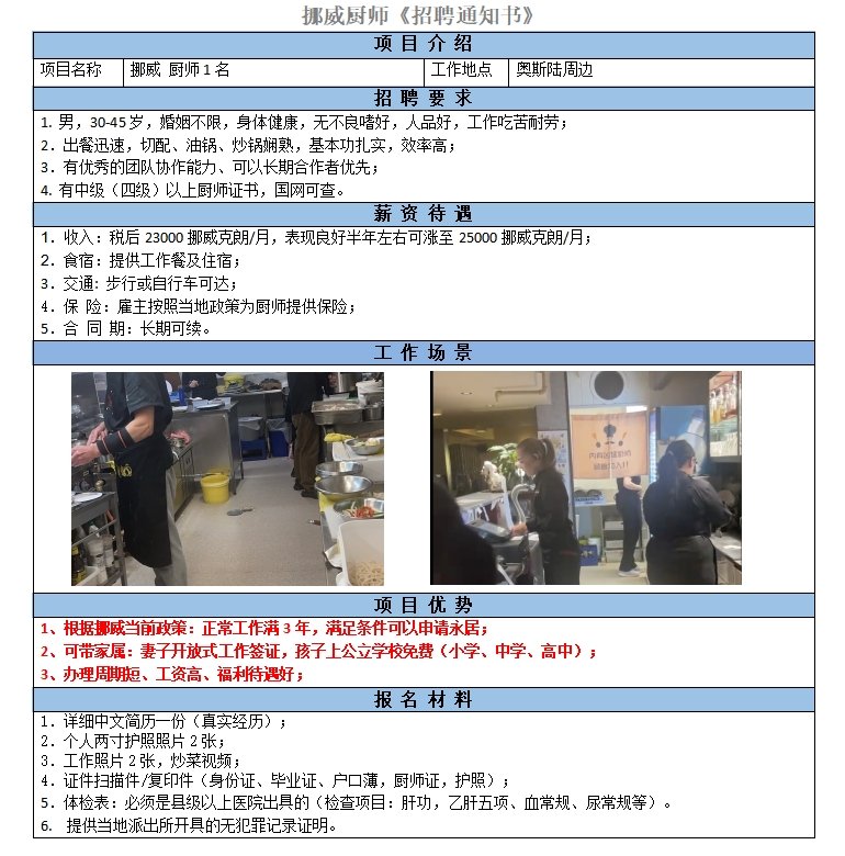 要求47歲以下、男性、高級廚師證、菜系不限,可獨立完成廚房全般工作,如烹飪、備貨、衛(wèi)生.稅后23000挪威克朗/月以上,有度假金
