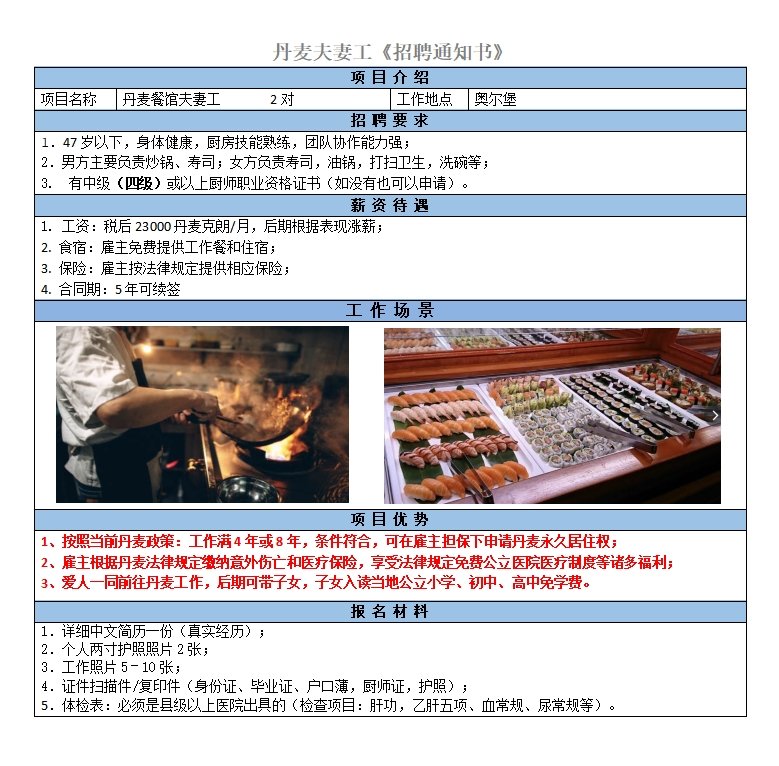 男方主要負責日料制作、女方負責壽司等其他廚房事務,男方會一點英語最佳;稅后22000丹麥克朗/月,后期根據表現漲薪