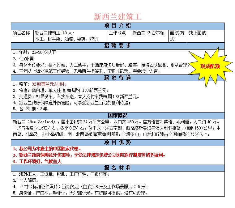 技術過硬、大工熟手,干活速度快質量好、踏實、懂得團隊配合、服從管理。三年以上海外建筑工作經驗,無新西蘭拒簽史,無犯罪記錄,需要培訓語言。