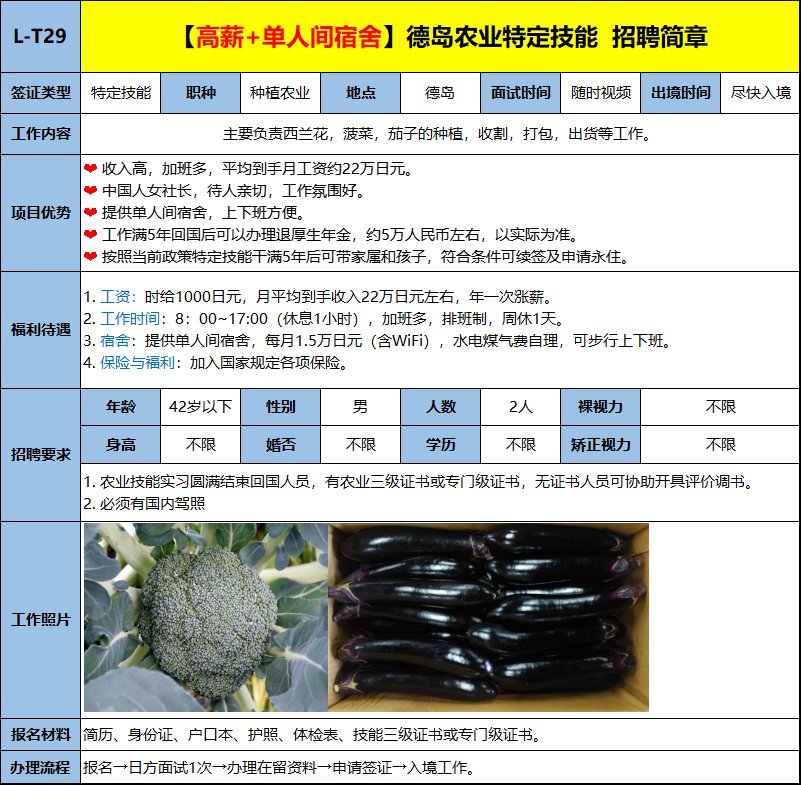 主要在大棚內種植茄子,淡季時可以申請回國探親。 收入高,有25%加班費,目前在職前輩平均到手工資約20萬日元左右。