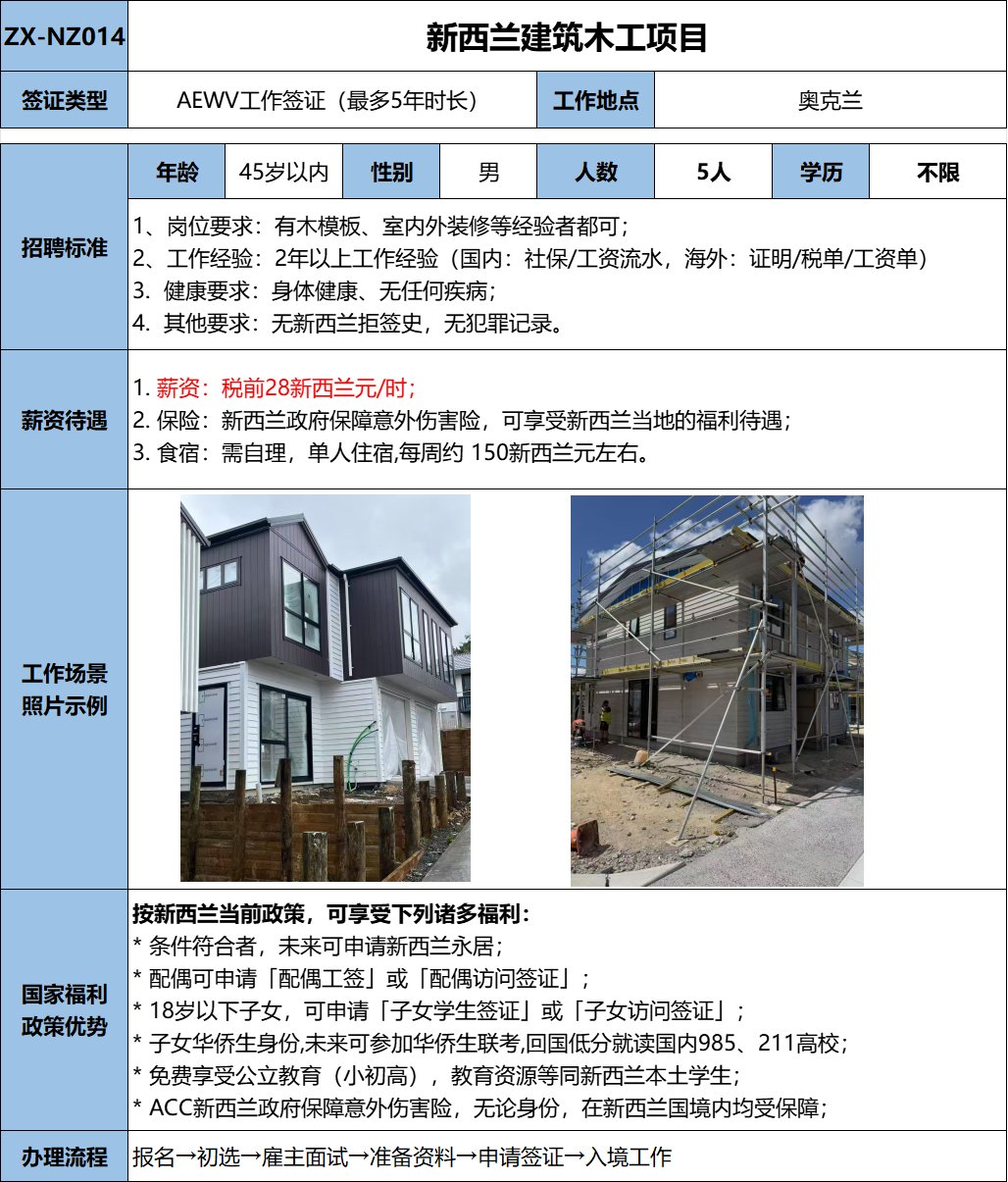 要求會熟練完成建筑木工工作,工作態度勤懇,服從指揮,稅前27.76新西蘭元/小時