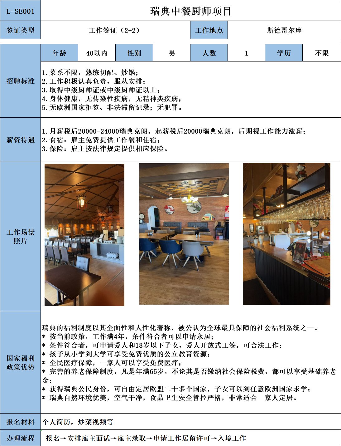 中餐廚師;菜系不限,熟練切配、炒鍋;取得中級廚師證或中級廚師證以上;起薪稅后20000瑞典克朗,后期視工作能力漲薪