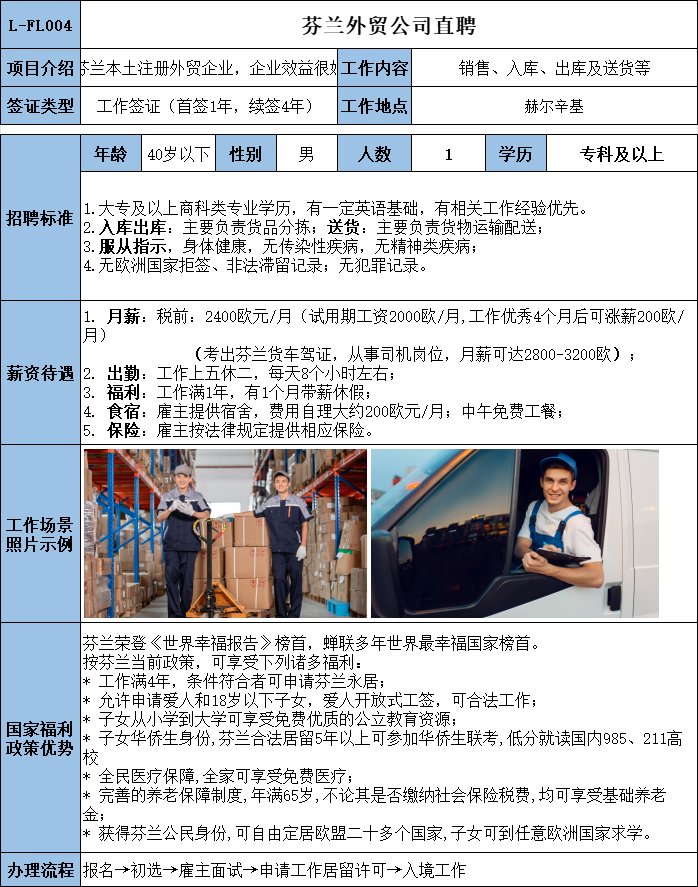 芬蘭中餐廚師,薪資高福利好,廚師50歲以下均可,包吃包住稅后2200歐,可移民,老板年輕大方,后期漲薪快幅度大。