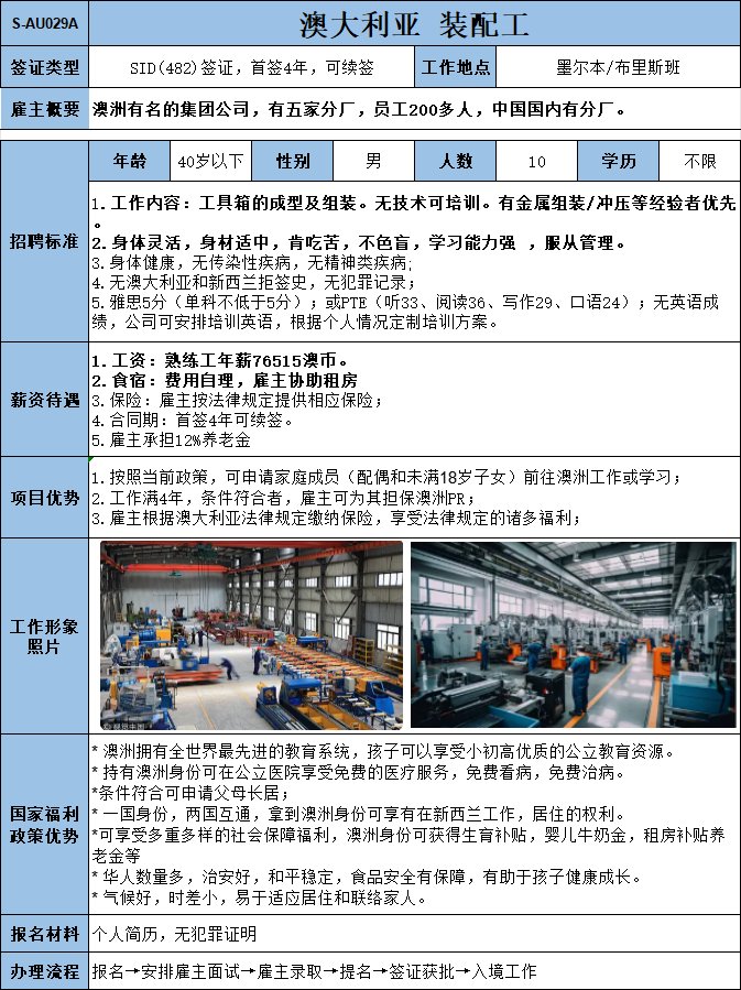 赴澳大利亞(墨爾本/布里斯班)- 裝配工