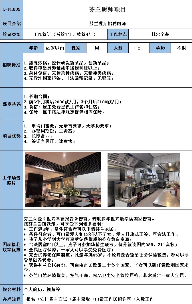 芬蘭高薪項目:包吃住,包水電,住宿地點離餐廳步行十分鐘,月薪2400歐(接近1.7w人民幣)純凈到手收入,要求40歲以下踏實樸實的師傅,不限地域不限菜系。